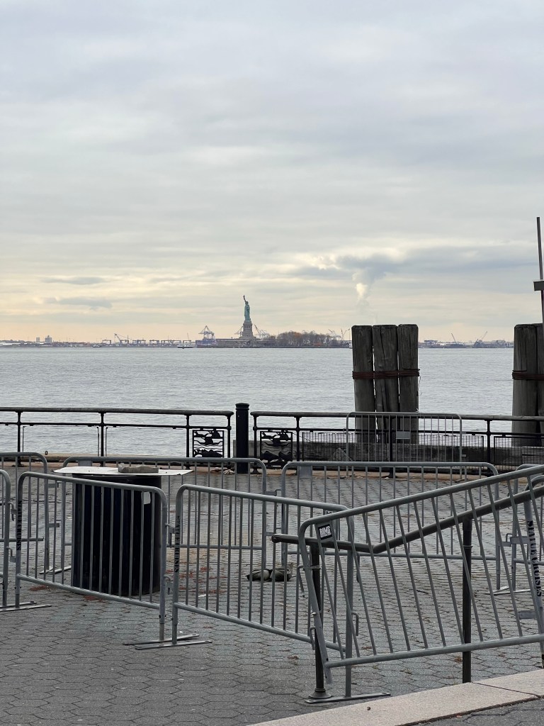 Once we finished at the memorial we walked down to Battery Park to get a look at the Statue of Liberty. We didn’t get a good look as at our point where we were at was at the ferries for and cruises for the island. In my haste I didn’t look to see about going down along the walking path in the park to get better views. I was just trying to get us to has many places as possible within a day. Eh, sorry mom.